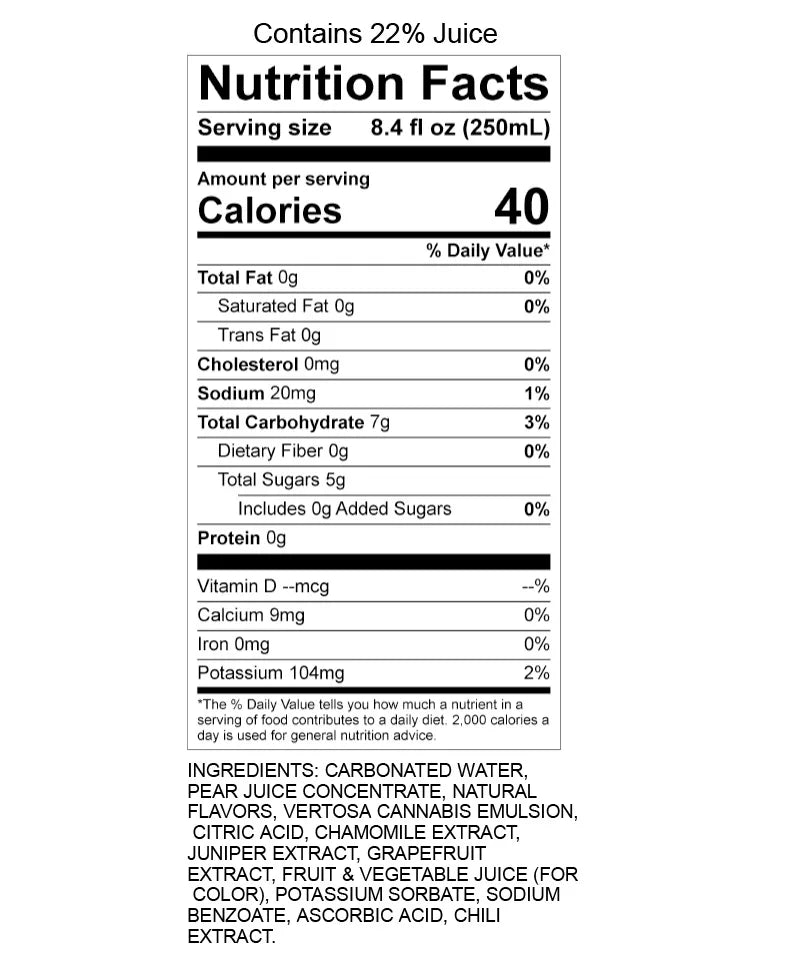 Full Ingredients List: Sparkling water, strawberry juice, basil essence, THC extract. Nutrition Facts: Calories: 25, Sugars: 3g, Gluten-free, Vegan.