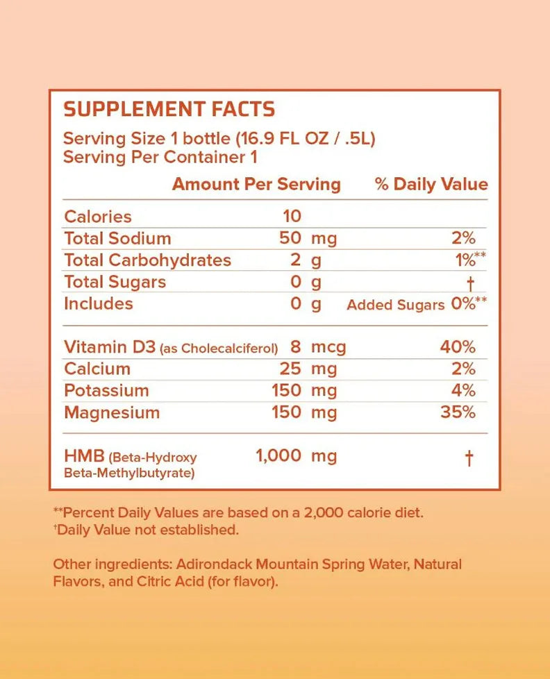 Full Ingredients List: Water, electrolytes, orange extract, peach extract, natural flavors. Nutrition Facts: Calories: 0, Sugars: 0g, Gluten-free, Vegan.