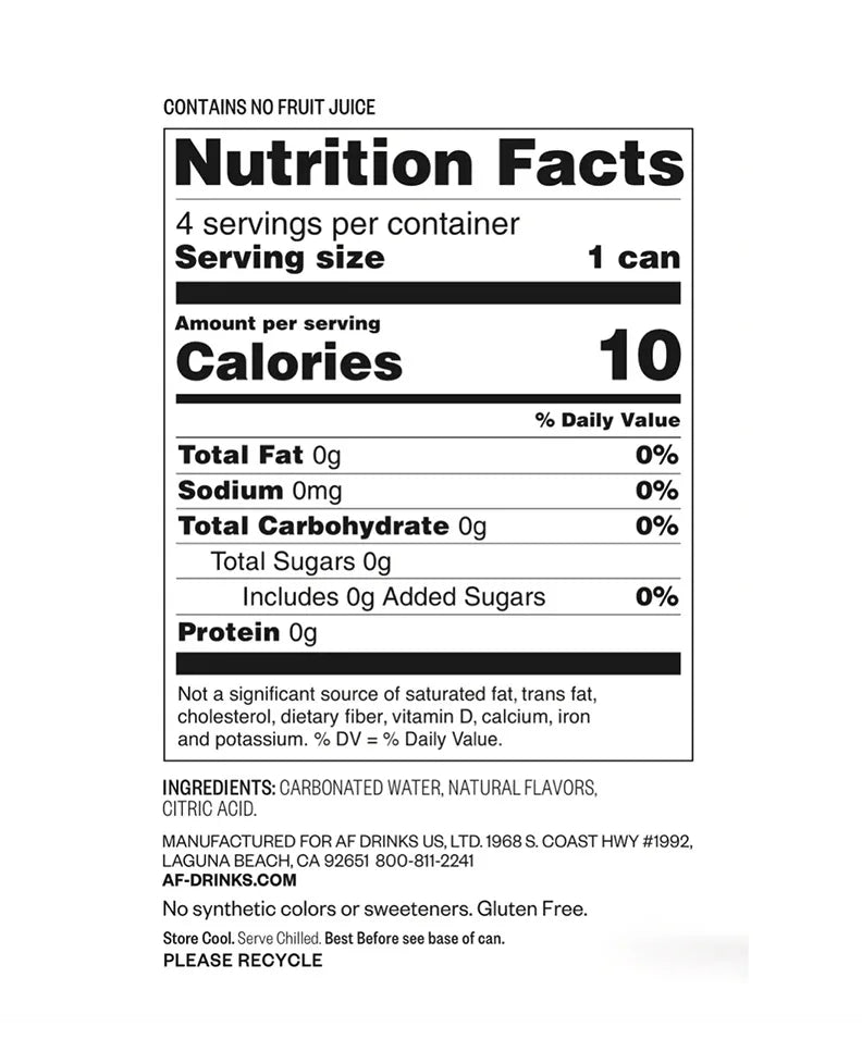 Full Ingredients List: Sparkling water, natural citrus flavors, botanical extracts, non-alcoholic vodka alternative. Nutrition Facts: Calories: 20, Sugars: 4g, Gluten-free, Vegan.