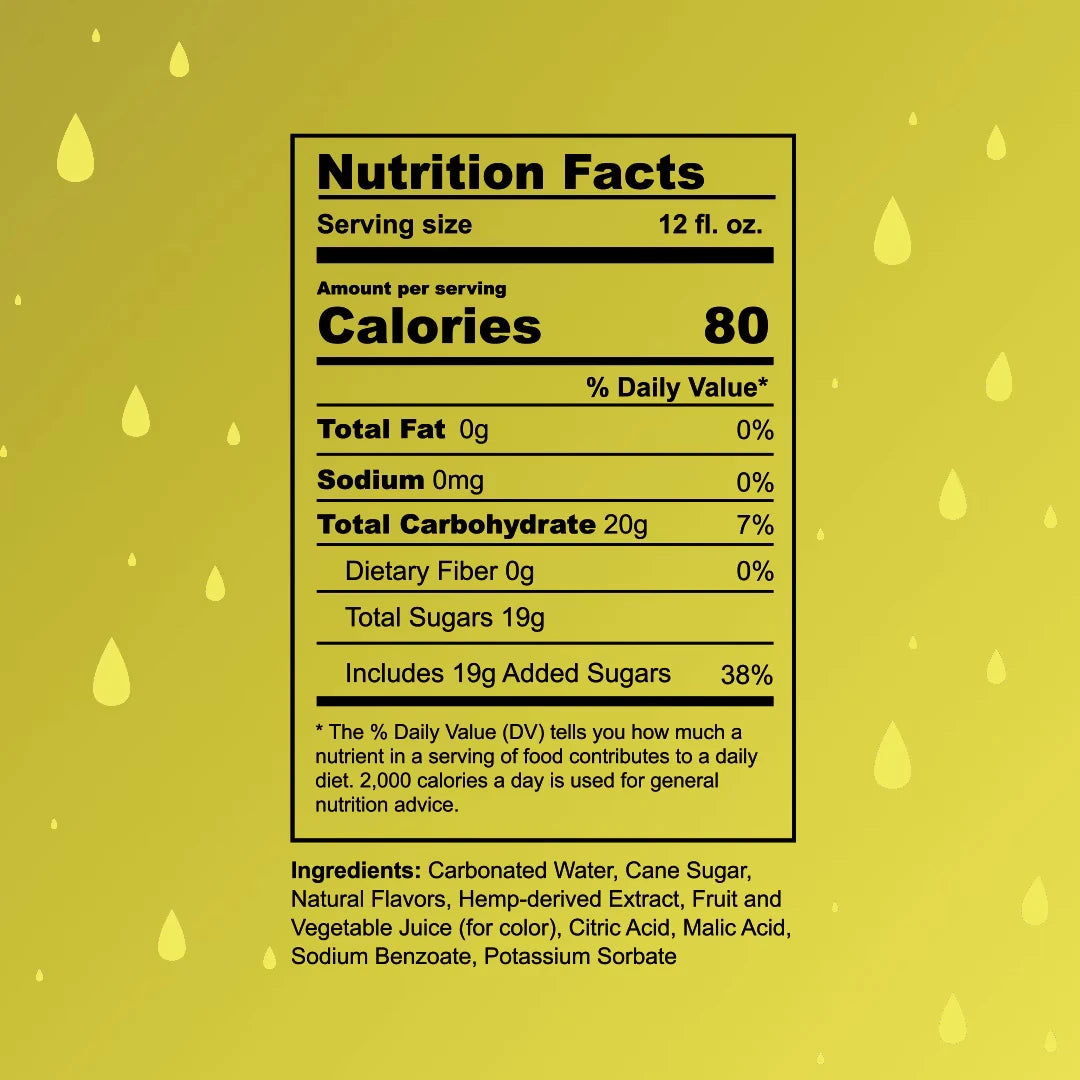 Carbonated Water, Cane Sugar, Natural Flavors, Hemp-derived Extract, Fruit and Vegetable Juice (for color), Citric Acid, Malic Acid, Sodium Benzoate, Potassium Sorbate
