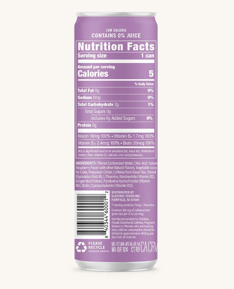 Full Ingredients List: Sparkling water, mixed berry extract, caffeine, citric acid. Nutrition Facts: Calories: 20, Sugars: 2g, Gluten-free, Vegan.
