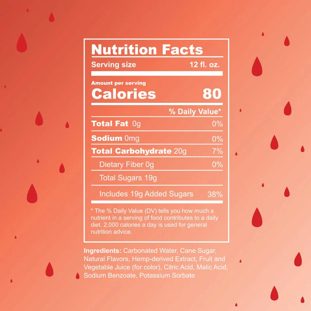 Carbonated Water, Cane Sugar, Natural Flavors, Hemp-derived Extract, Fruit and Vegetable Juice (for color), Citric Acid, Malic Acid, Sodium Benzoate, Potassium Sorbate